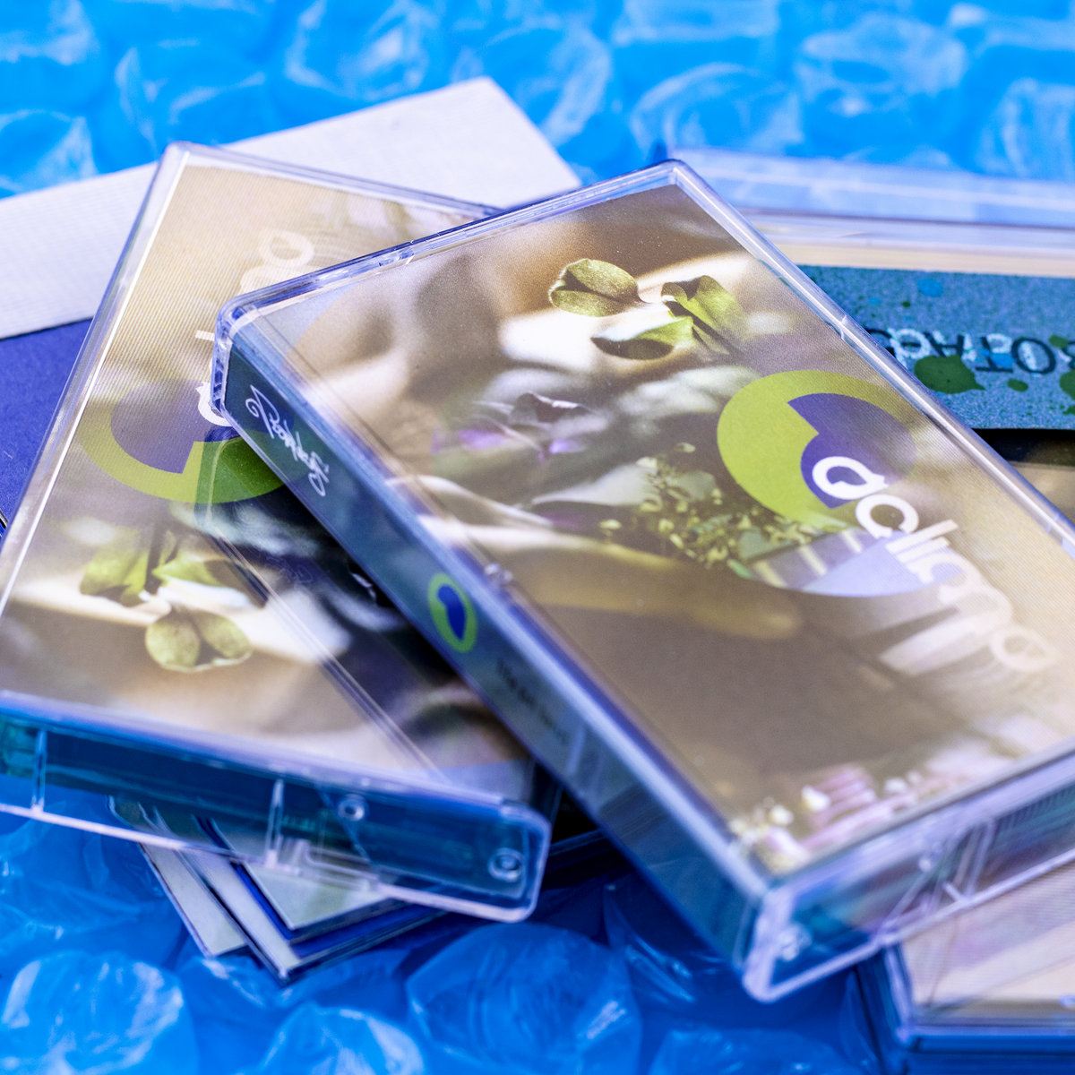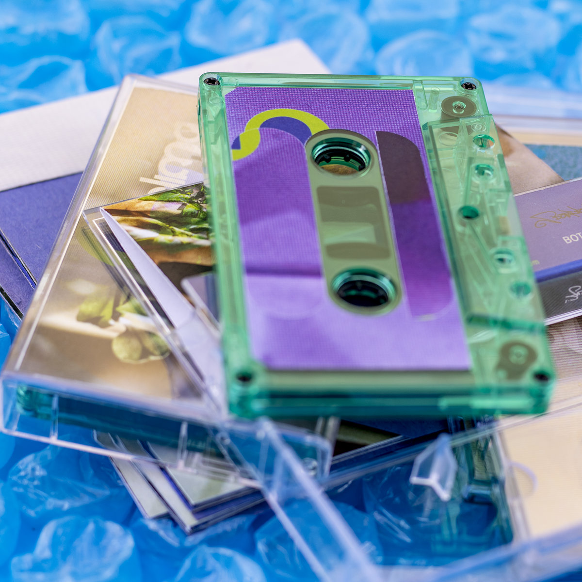 (1) cassette tape. Each tape is hand dubbed (real time) on a C-20, tape color: Emerald Green. 1-sided, 2 panel full color j-card inside a clear Norelco case. Shrink wrapped. Note: artwork on the cassette tape labels vary. (1) 5" x 4", 24 page handmade experimental book with full-color & black/white printing on a variety of paper. Comes wrapped in a sealed poly bag. Book title: life on land. (1) CD, silver top, black playable bottom. Slim clear and blue case with full color 1-sided cover and fold in insert with track listing with painted/printed OBI strip. Only 3 sets made.
